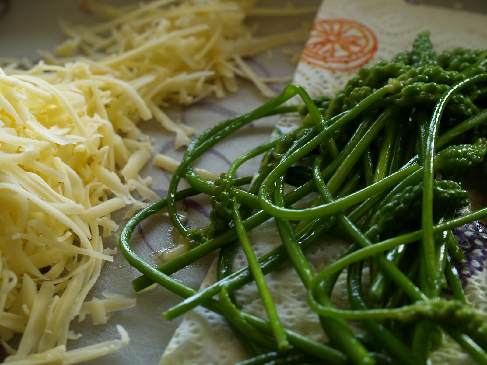 Fish that lot out and grate some cheese: add more butter to the pan, swirl it around and sprinkle the cheese on top, then pour the eggs and cream over and let that cook gently.